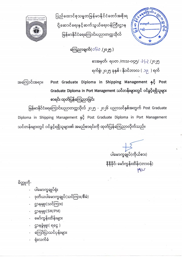 105 Post Graduate Diploma in Shipping Management,Post Graduate Diploma in Port Managementနှင့် Post Graduate Diploma in Transport and Logistics Management သင်တန်များတွင် ဝင်ခွင့် ရရှိသူများစာရင်အား ထုတ်ပြန်ကြေညာခြင်း 11/21/2022 1:16:32 AM News
