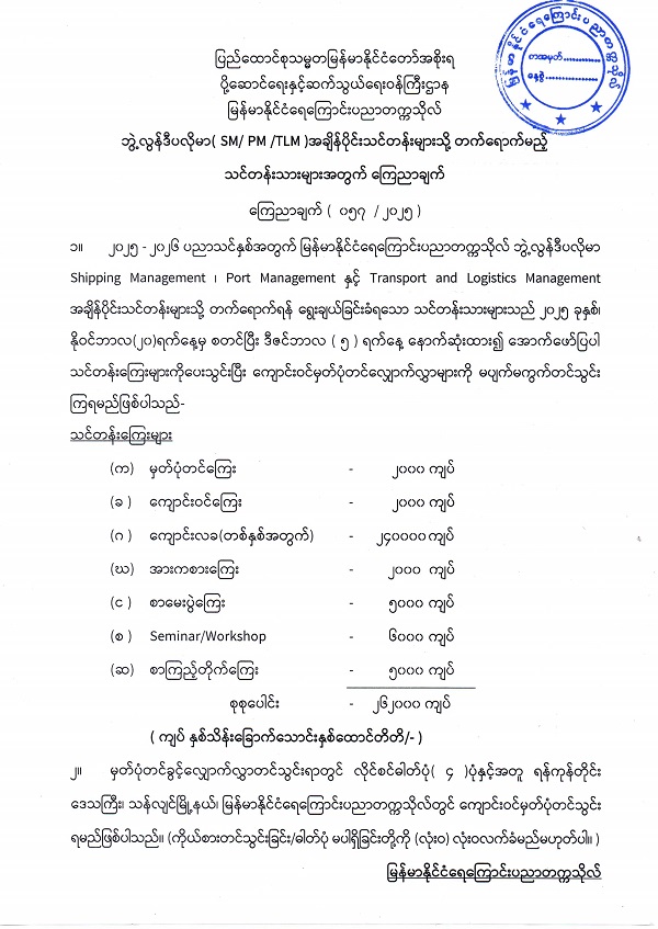 139 ၂၀၂၃-၂၀၂၄ ပညာသင်နှစ် ဘွဲ့လွန်ဒီပလိုမာ သင်တန်းများ (Diploma in Shipping Management, Port Management and Transport and Logistics Management)အတွက် အောင်စာရင်းထုတ်ပြန်ခြင်း 10/30/2024 5:36:36 AM News